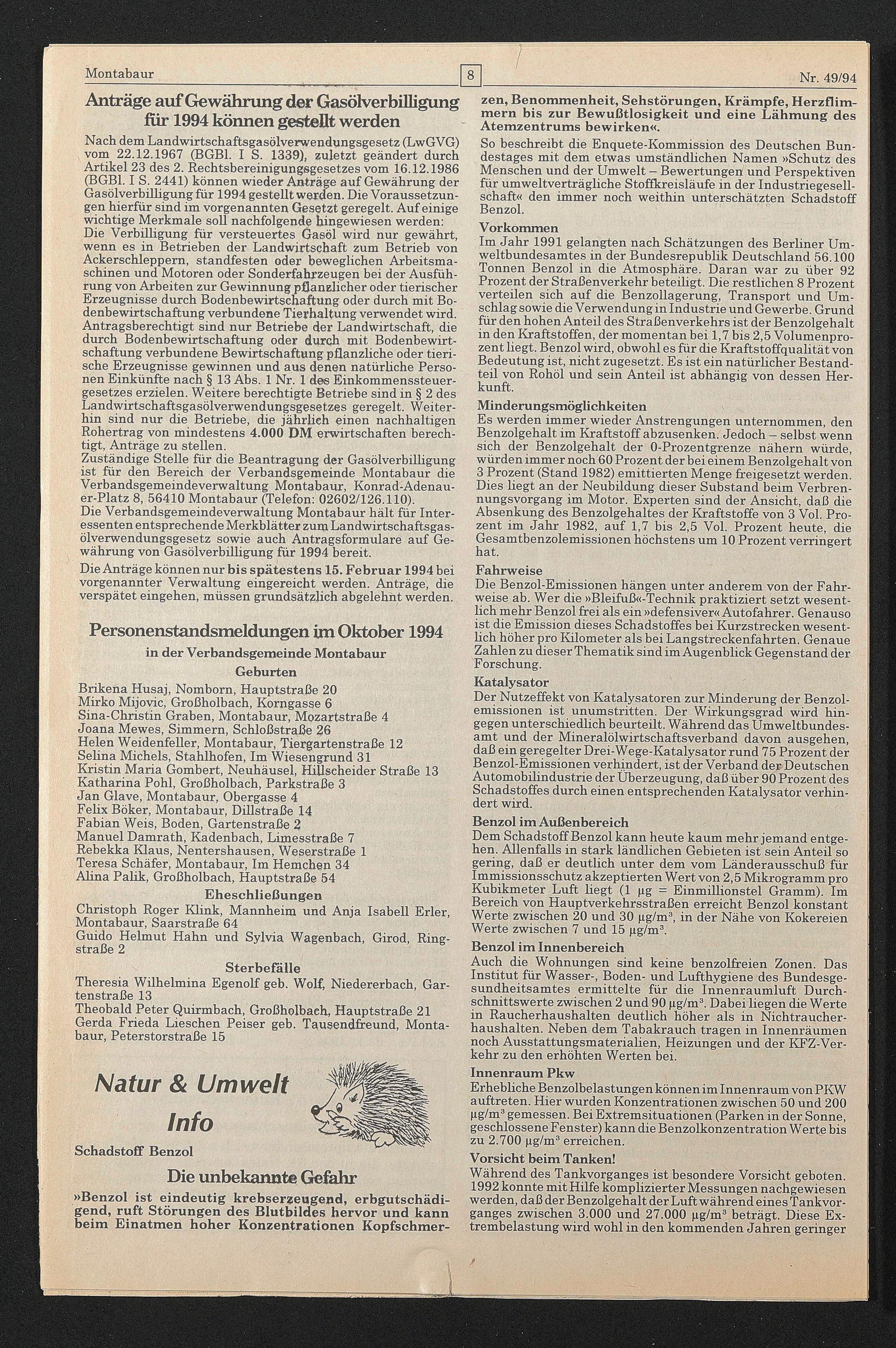 Die Verbandsgemeindeverwaltung Montabaur hält für Interessenten entsprechende Merkblätter zum Landwirtschaftsgasölverwendungsgesetz sowie auch Antragsformulare auf Gewährung von Gasölverbilligung für 1994 bereit.