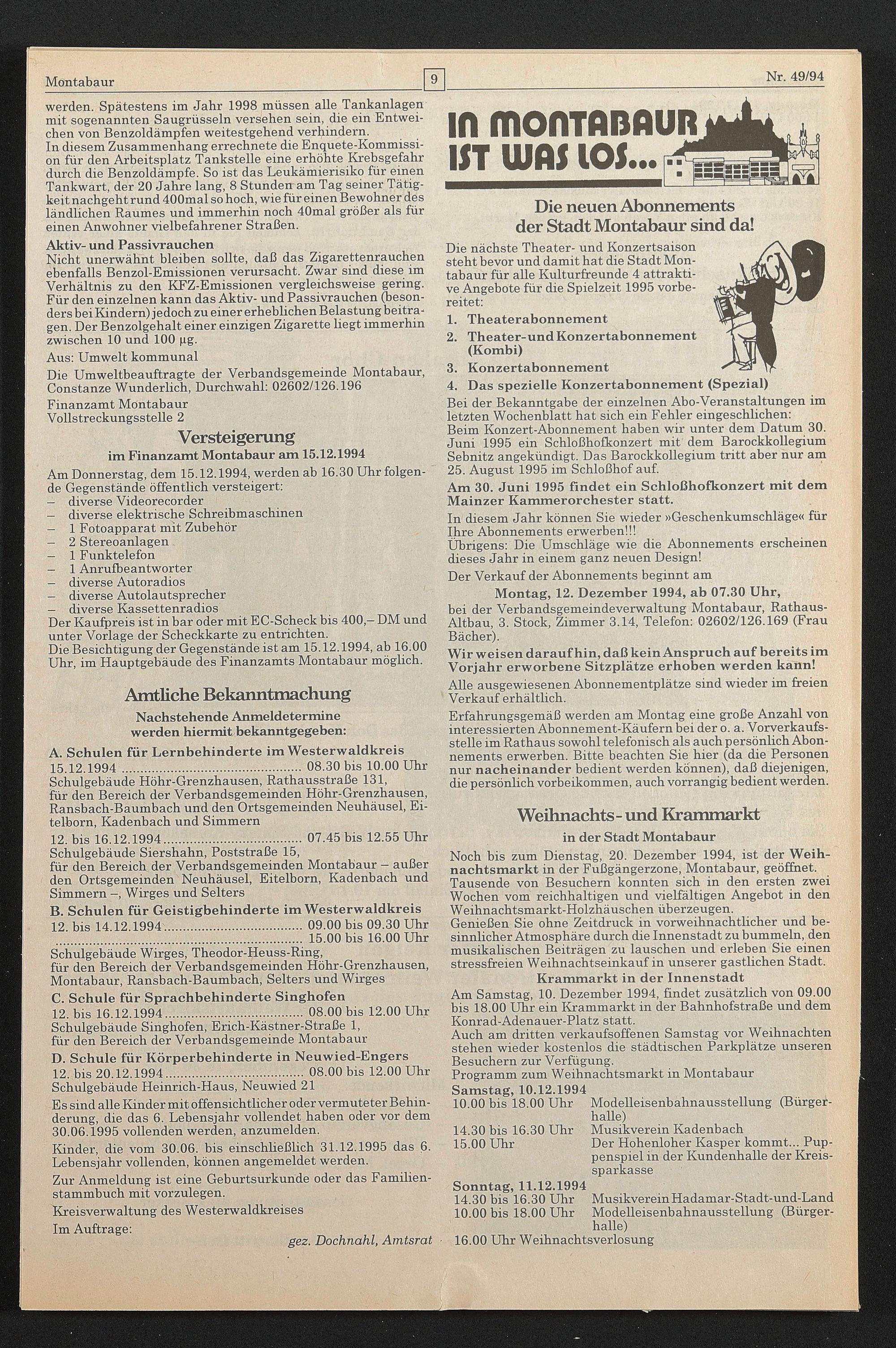 Montag, 12. Dezember 1994, ab 07.30 Uhr, bei der Verbändsgemeindeverwaltung Montabaur, Rathaus- Altbau, 3. Stock, Zimmer 3.14, Telefon: 02602/126.169 (Frau Bächer).