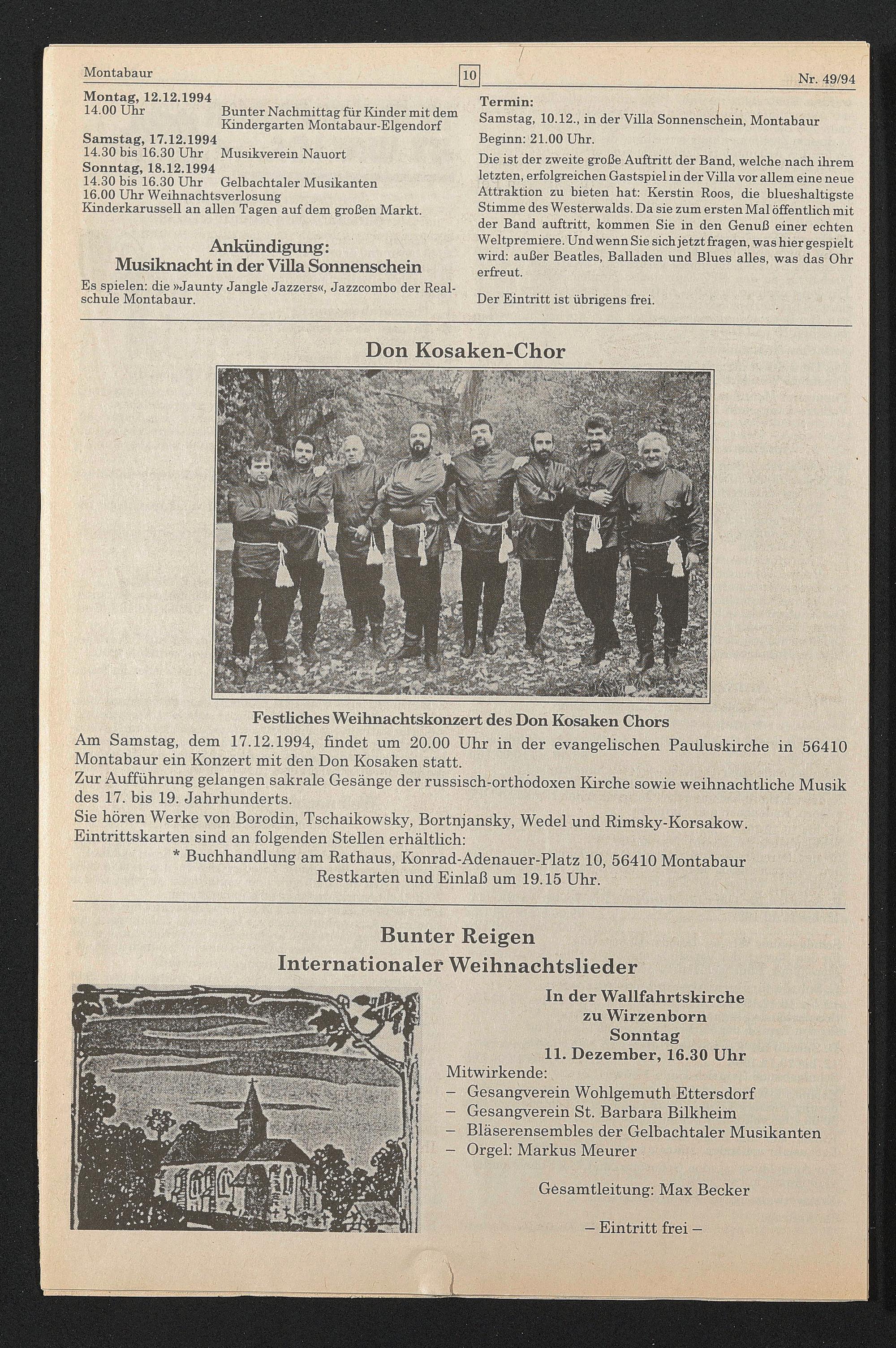 Am Samstag, dem 17.12.1994, findet um 20.00 Uhr in der evangelischen Pauluskirche in 56410 Montabaur ein Konzert mit den Don Kosaken statt.
