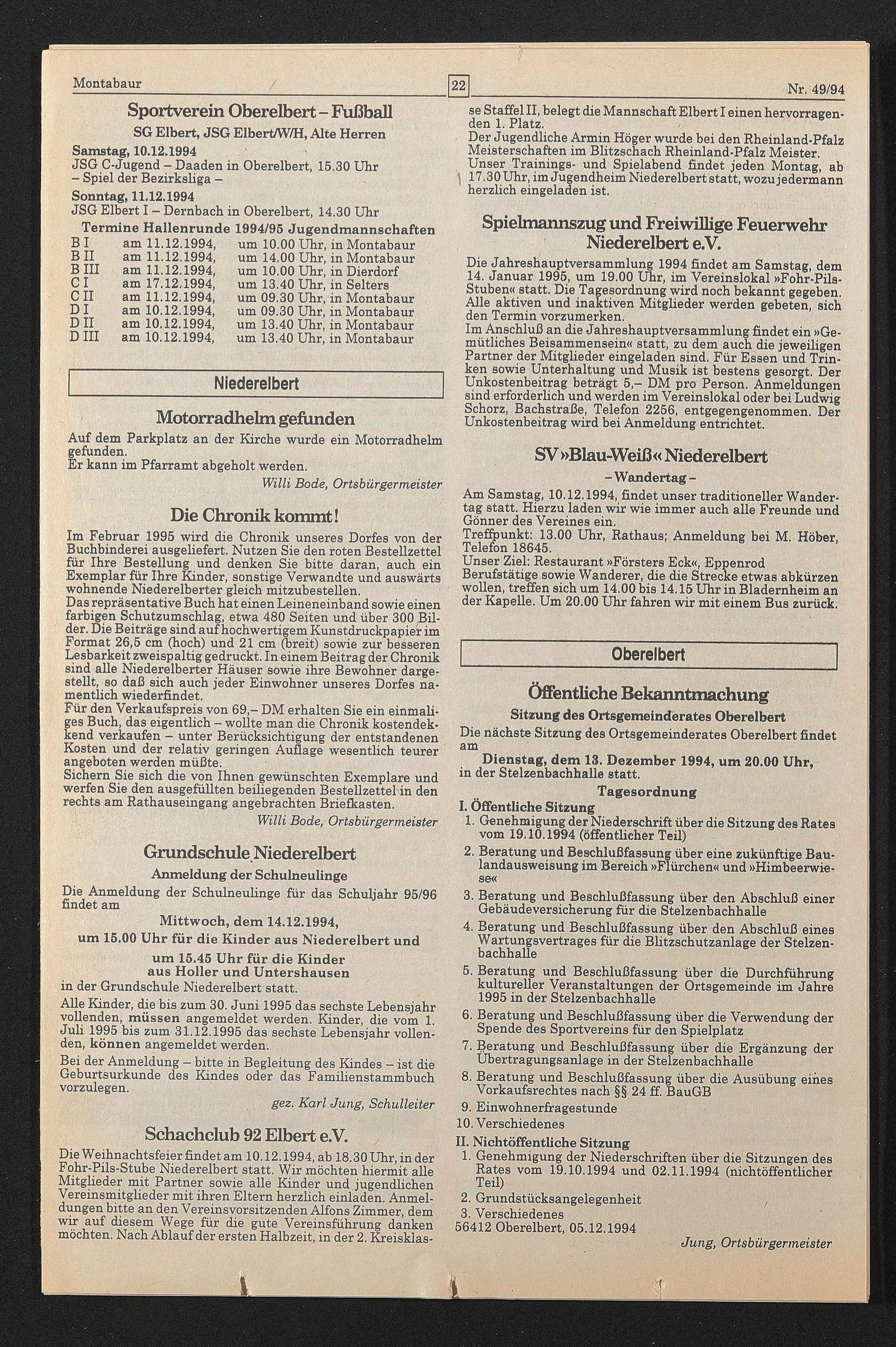 Die Weihnachtsfeier findet am 10.12.1994, ab 18.30 Uhr, in der Fohr-Pils-Stube Niederelbert statt. Wir möchten hiermit alle Mitglieder mit Partner sowie alle Kinder und jugendlichen Vereinsmitglieder mit ihren Eltern herzlich einladen. Anmeldungen bitte an den Vereinsvorsitzenden Alfons Zimmer, dem wir auf diesem Wege für die gute Vereinsführung danken möchten. Nach Ablauf der ersten Halbzeit, in der 2. Kreisklas
