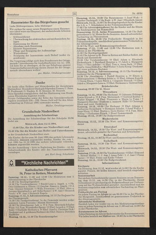 Sonntag, 18.12., 09.00 Uhr Hochamt: ff Ehel. Johann u. Katharina Steinebach / f Hermann Schüler, f Josef Wolf u. t Anne Klein / ff Ehel. Martin u. Gerti Hörter / ft d. Farn. Mies- Schlag / f Katharina Kirsch / f Rosel Dommermuth Montag, 19.12., 19.00 Uhr Bußgottesdienst