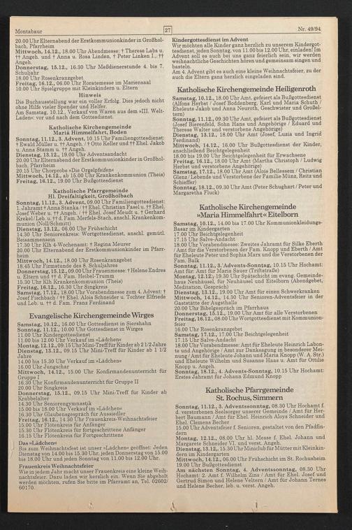 Am nächsten Sonntag, 4. Adventssonntag, 08.30 Uhr Hochamt: 2. Amt f. Wilhelm Zins / Amt für Ehel. Josef und Gertrud Simon und Helene Veltern / Amt für Johann Ternes und Helene Becher, leb. u. verst. Angeh.
