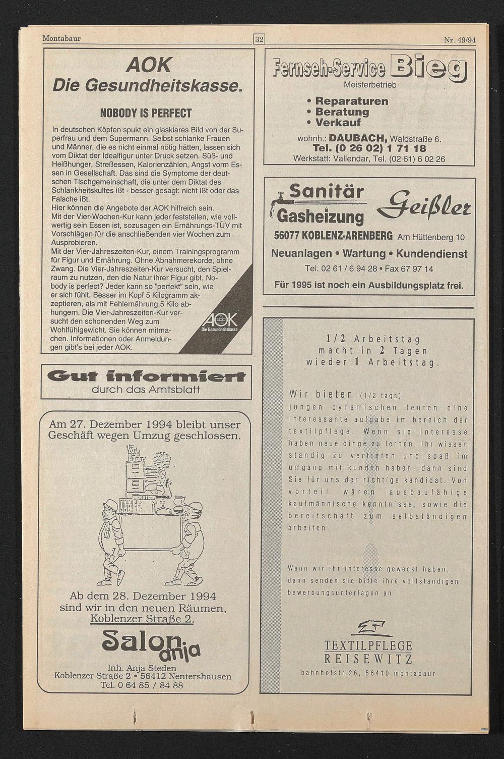 Am 27. Dezember 1994 bleibt unser Geschäft wegen Umzug geschlossen.