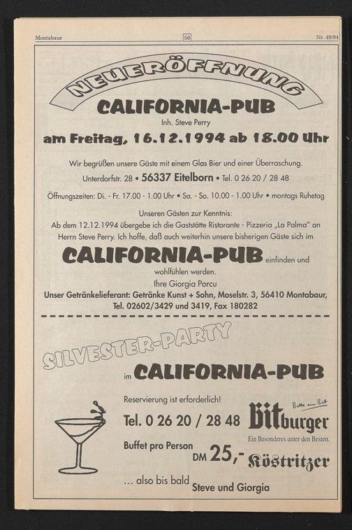 Ab dem 12.12.1994 übergebe ich die Gaststätte Ristorante - Pizzeria „La Palma" an Herrn Steve Perry. Ich hoffe, daß auch weiterhin unsere bisherigen Gäste sich im