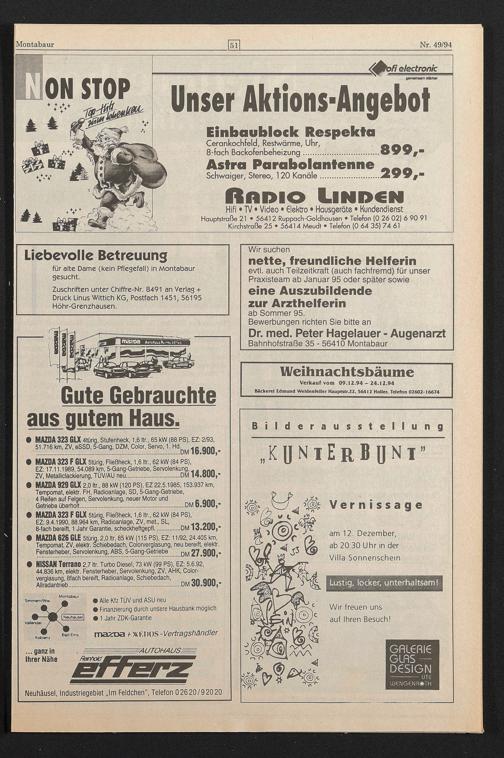 Verkauf vom 09.12.94 - 24.12.94 Bäckerei Edmund Weidenfeller Hauptstr.22, .56412 Holler, Telefon 02602-16674