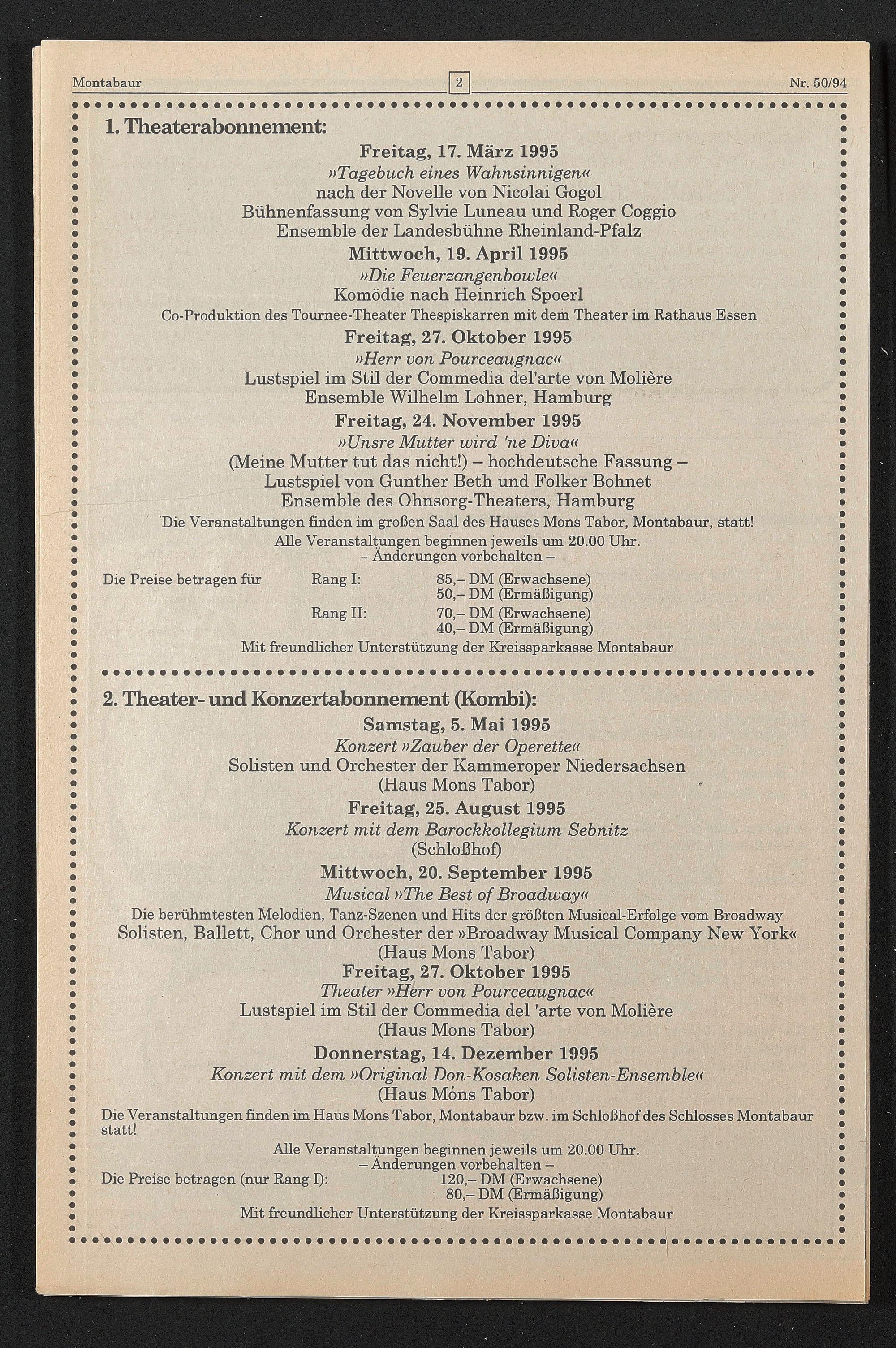 Freitag, 17. März 1995 »Tagebuch eines Wahnsinnigen« nach der Novelle von Nicolai Gogol Bühnenfassung von Sylvie Luneau und Roger Coggio Ensemble der Landesbühne Rheinland-Pfalz Mittwoch, 19. April 1995 »Die Feuerzangenbowle«