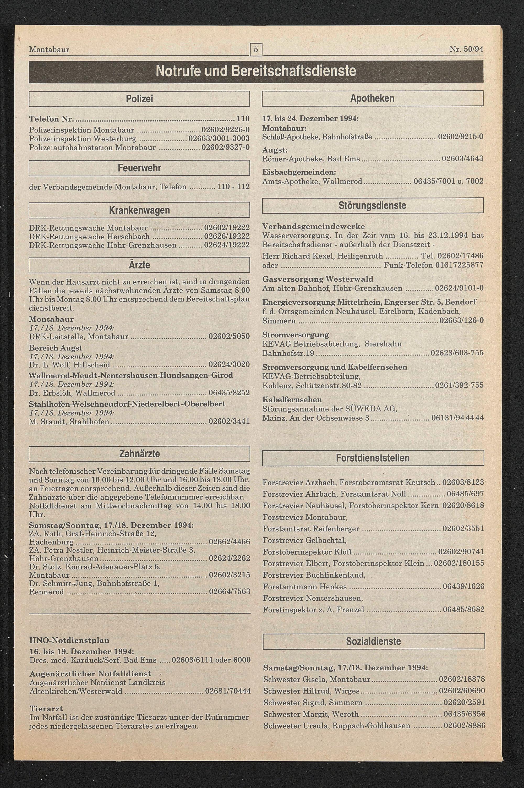 HNO-Notdienstplan 16. bis 19. Dezember 1994: