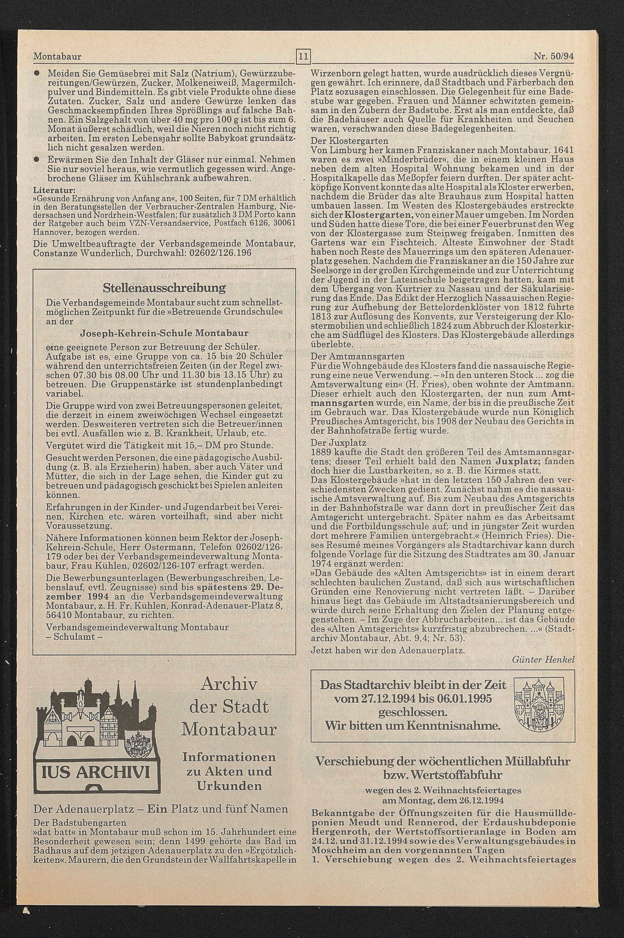 Die Bewerbungsunterlagen (Bewerbungsschreiben, Lebenslauf, evtl. Zeugnisse) sind bis spätestens 29. Dezember 1994 an die Verbandsgemeindeverwaltung Montabaur, z. H. Fr-. Kühlen, Konrad-Adenauer-Platz 8, 56410 Montabaur, zu richten. Verbandsgemeindeverwaltung Montabaur — Schulamt —