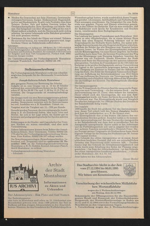 Das Stadtarchiv bleibt in der Zeit vom 27.121994 bis 06.01.1995 geschlossen.