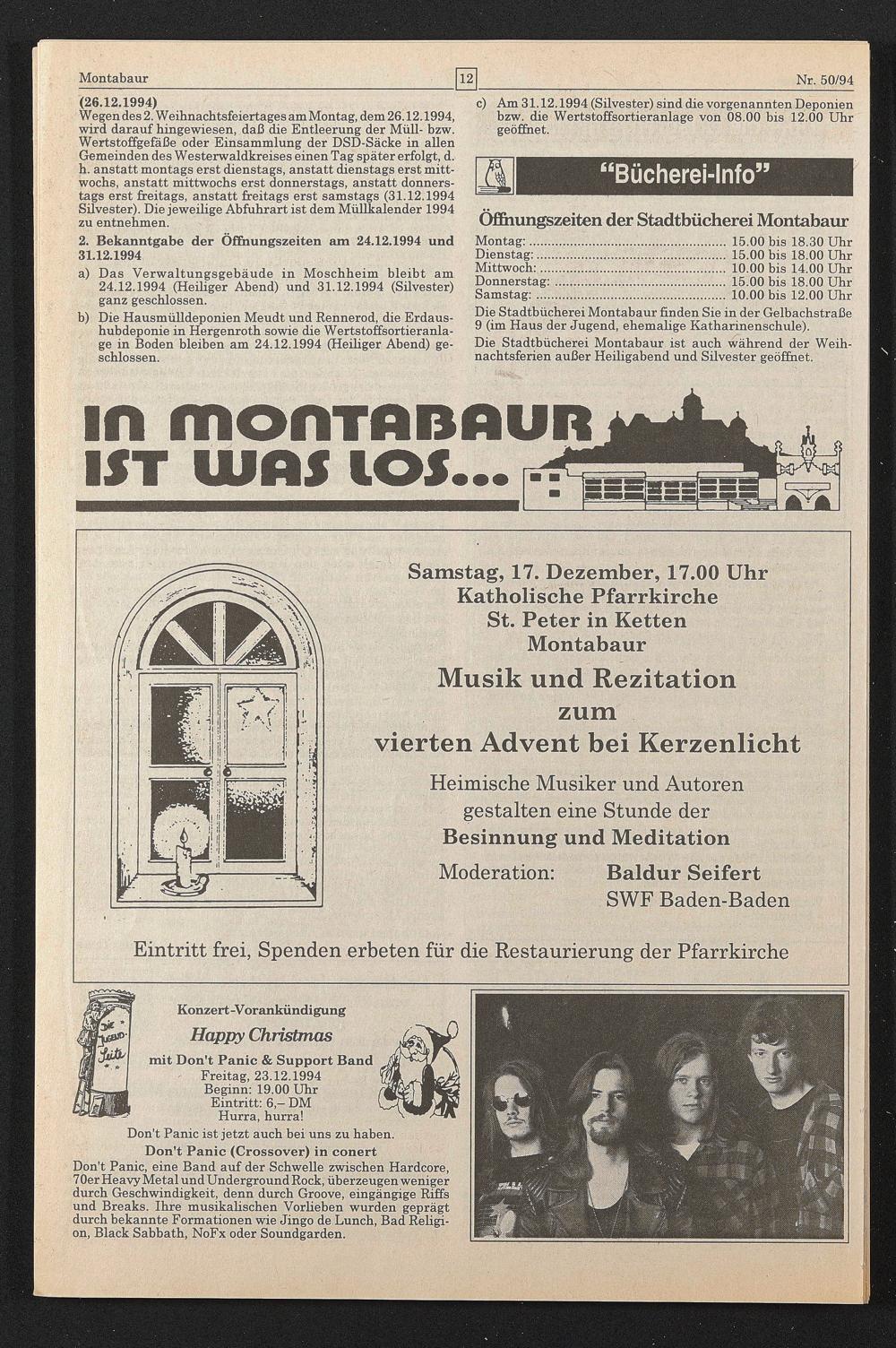 mit Don't Panic & Support Band Freitag, 23.12.1994 Beginn: 19.00 Uhr Eintritt: 6,- DM Hurra, hurra!