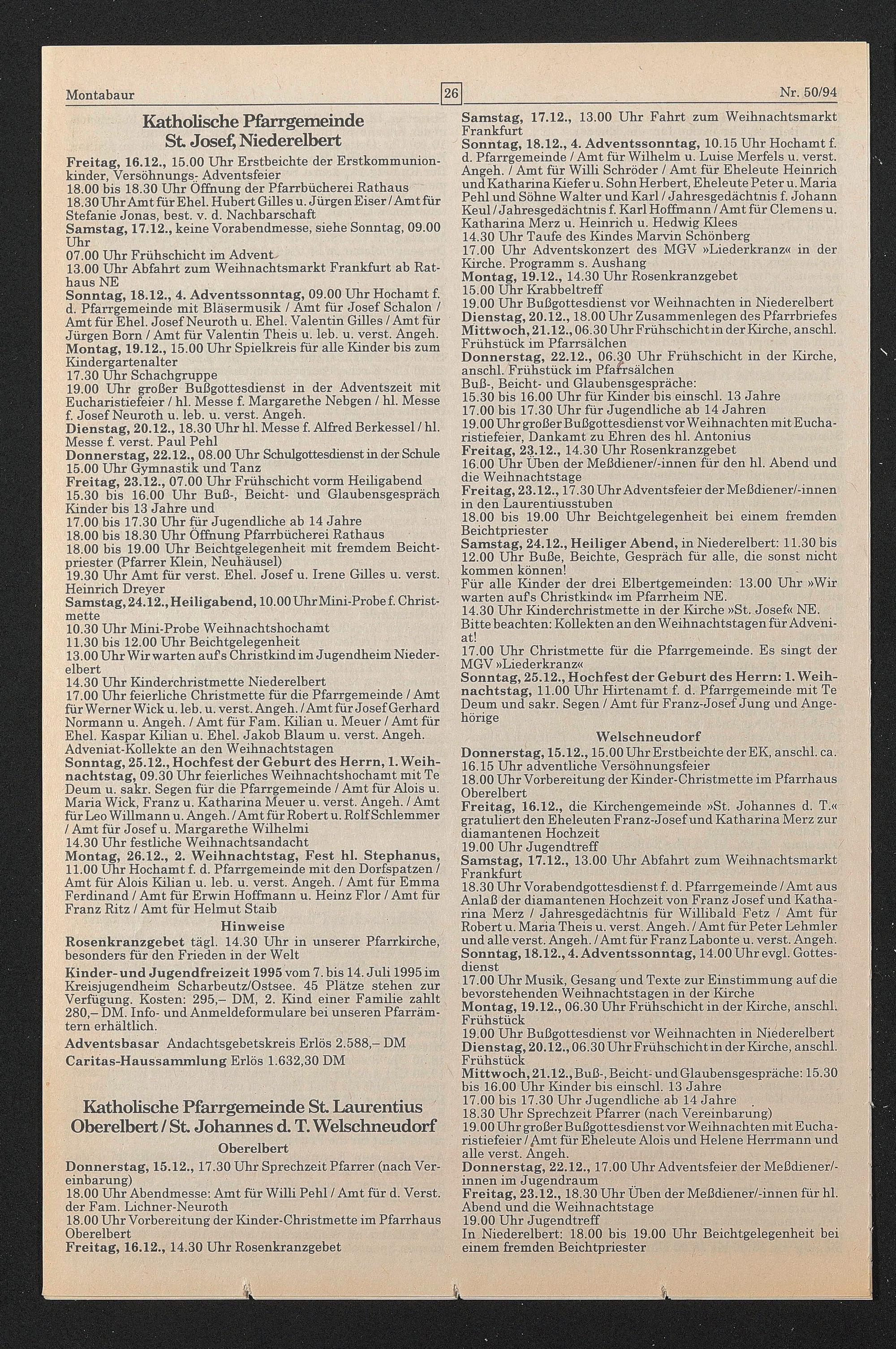 Sonntag, 18.12., 4. Adventssonntag, 10.15 Uhr Hochamt f. d. Pfarrgemeinde / Amt für Wilhelm u. Luise Merfels u. verst. Angeh. / Amt für Willi Schröder / Amt für Eheleute Heinrich und Katharina Kiefer u. Sohn Herbert, Eheleute Peter u. Maria Pehl und Söhne Walter und Karl / Jahresgedächtnis f. Johann Keul / Jahresgedächtnis f. Karl Hoffmann / Amt für Clemens u. Katharina Merz u. Heinrich u. Hedwig Klees
