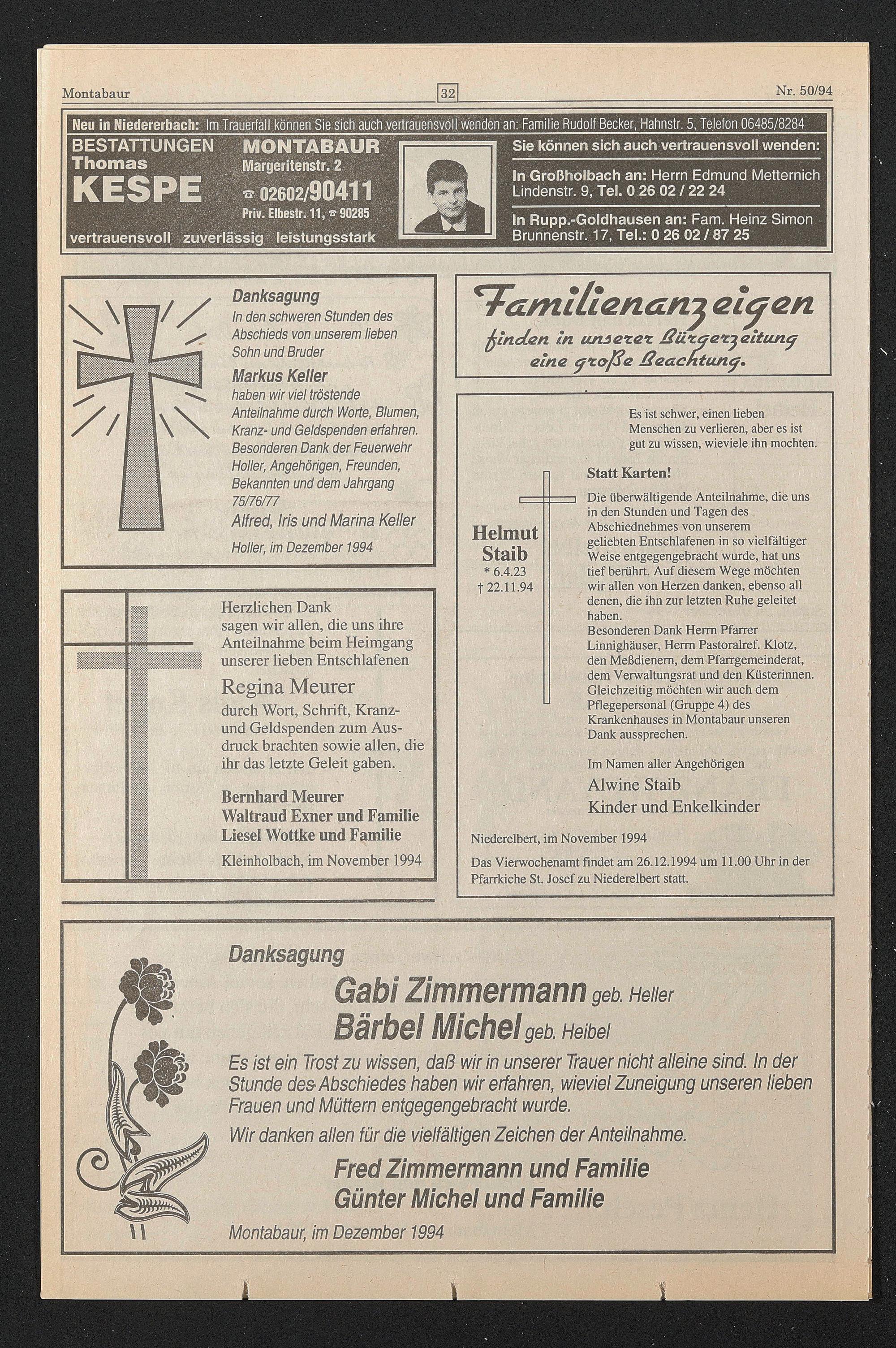 Das Vierwochenamt findet am 26.12.1994 um 11.00 Uhr in der