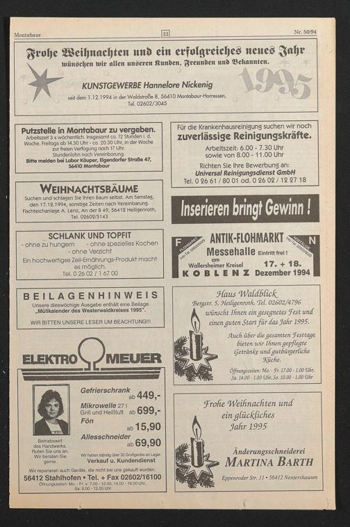 Suchen und schlagen Sie Ihren Baum selbst. Am'Samstag, den 17.12.1994, sonstige Zeiten nach Vereinbarung. Fischteichanlage A. Lenz, An der B 49, 56412 Heiligenroth, Tel. 02602/5143