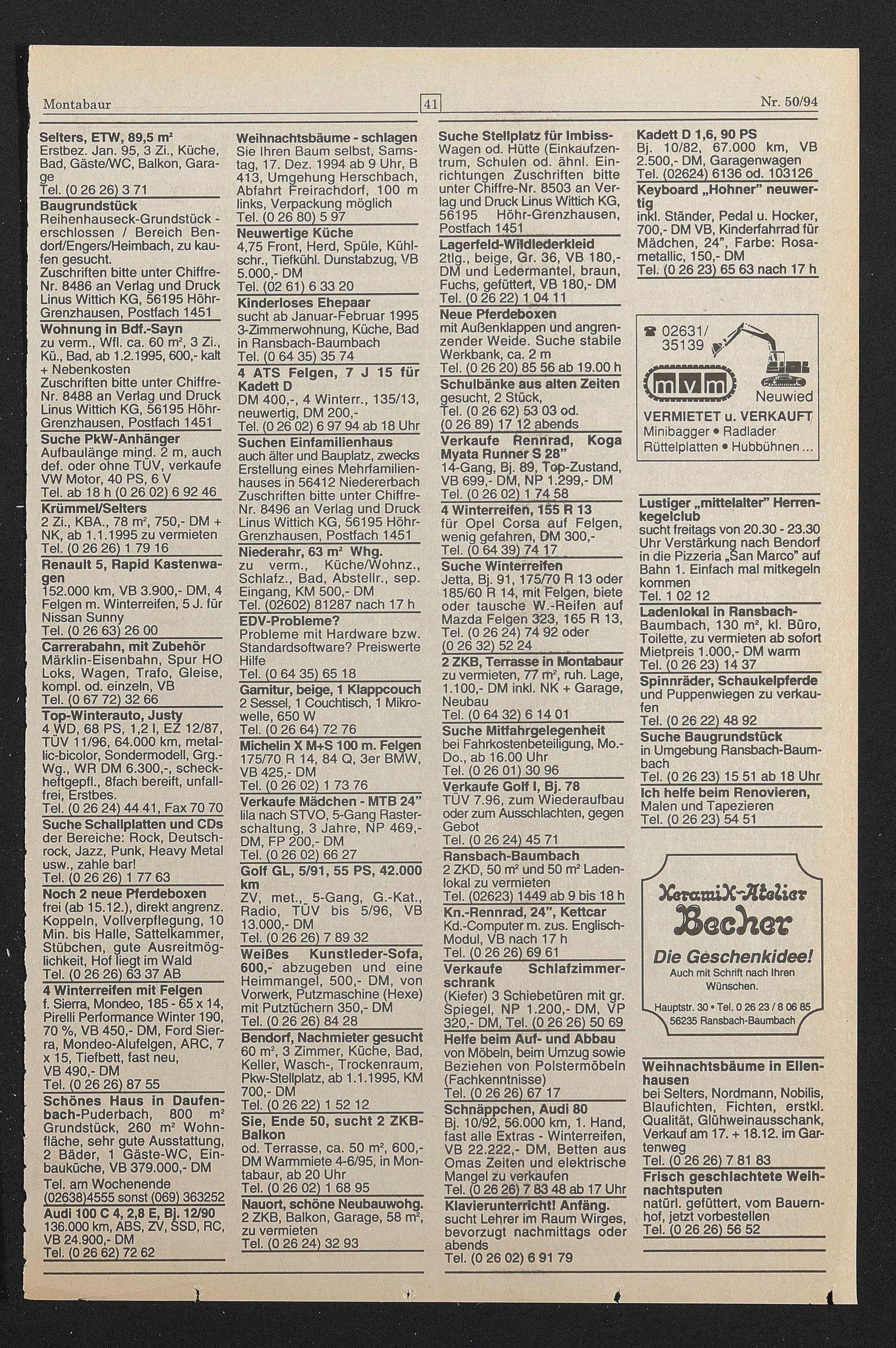 Sie Ihren Baum selbst, Samstag, 17. Dez. 1994 ab 9 Uhr, B 413, Umgehung Herschbach, Abfahrt Freirachdorf, 100 m links, Verpackung möglich Tel. (0 26 80) 5 97_