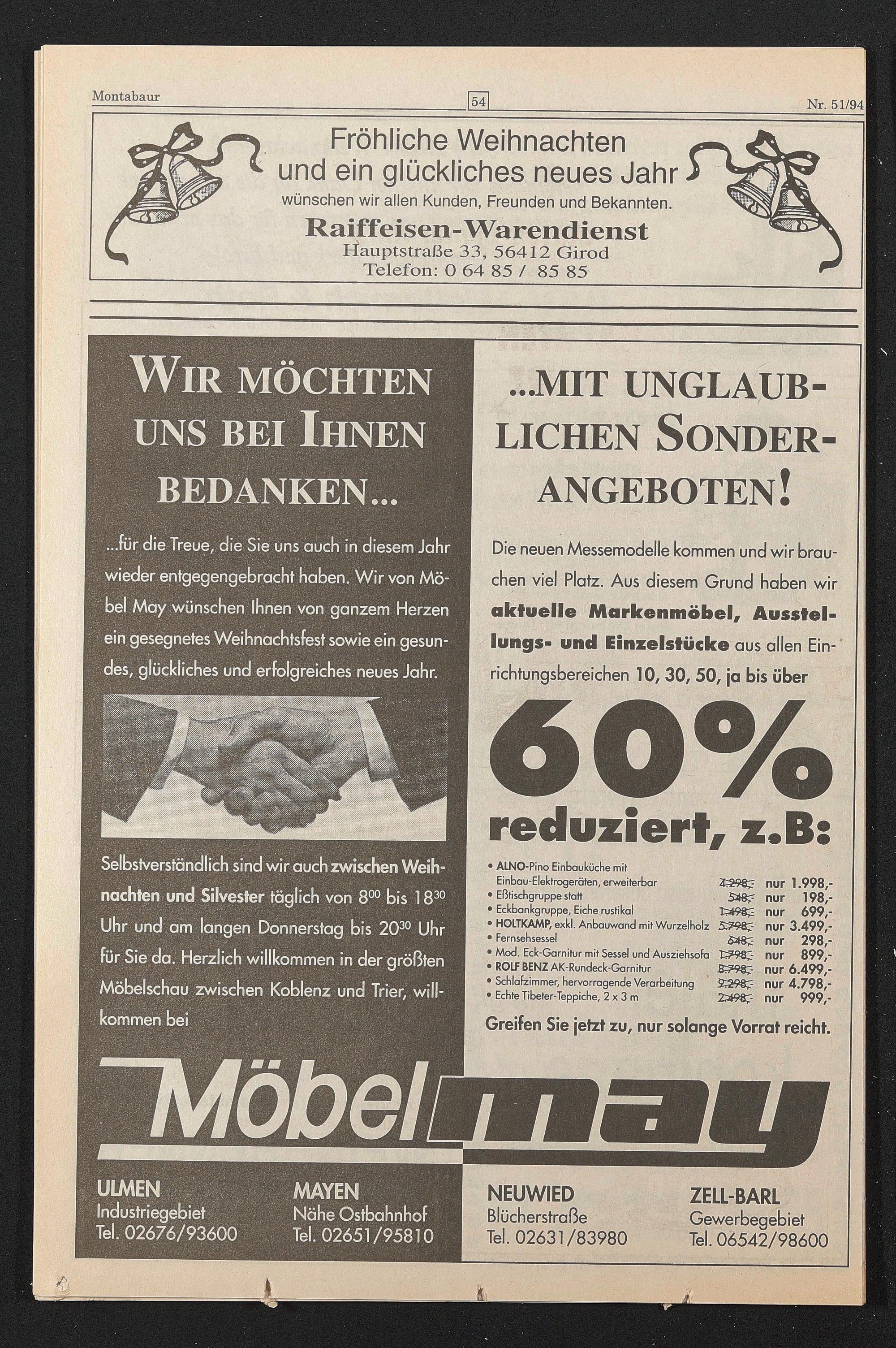 Selbstverständlich sind wir auch zwischen Weih nachten und Silvester täglich von 8 00 bis 18 30 Uhr und am langen Donnerstag bis 20 30 Uhr für Sie da. Herzlich willkommen in der größten Möbelschau zwischen Koblenz und Trier, will kommen bei