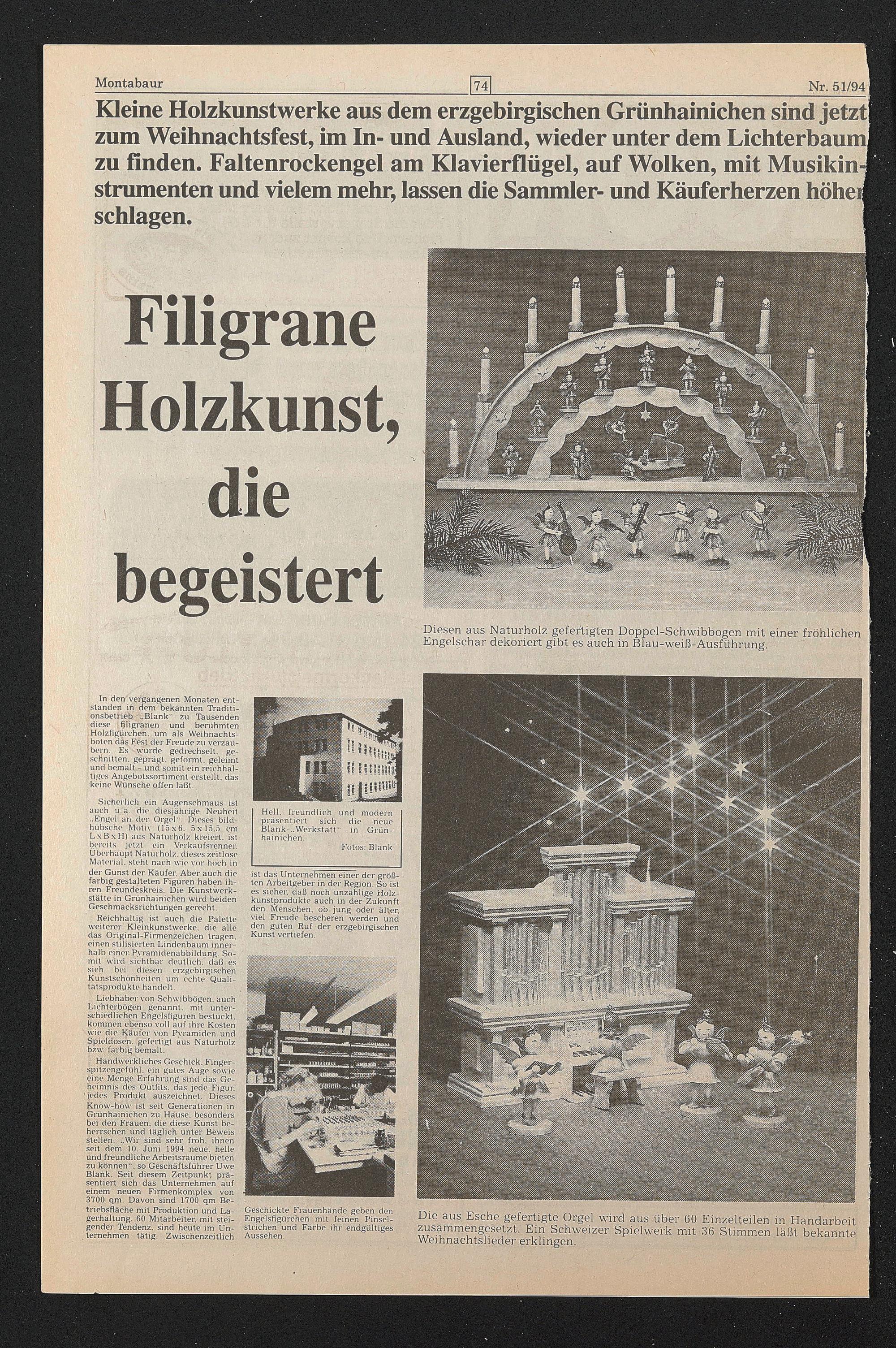 ln den vergangenen Monaten entstanden in dem bekannten Traditionsbetrieb ..Blank“ zu Tausenden diese filigranen und berühmten Holzfigurchen. um als Weihnachtsboten däs Fest der Freude zu verzaubern. Es wurde gedrechselt, geschnitten, geprägt, geformt, geleimt und bemalt - und somit ein reichhaltiges Angebotssortiment erstellt, das keine Wünsche offen läßt.