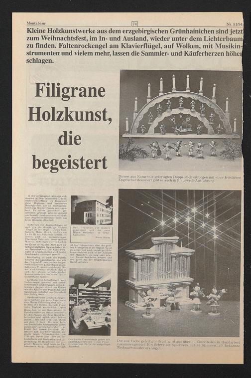 Handwerkliches Geschick. Fingerspitzengefühl. ein gutes Auge sowie eine Menge Erfahrung sind das Geheimnis des Outfils, das jede Figur, 'jedes Produkt auszeichnet. Dieses Know-how ist seil Generationen in Grünhainichen zu Hause, besonders bei den Frauen, die diese Kunst beherrschen und täglich unter Beweis stellen. ..Wir sind sehr froh, ihnen seit dem 10. Juni 1994 neue, helle und freundliche Arbeitsräume bieten zu können", so Geschäftsführer Uwe Blank. Seit diesem Zeitpunkt präsentiert sich das Unternehmen auf einem neuen Firmenkomplex von 3700 qm. Davon sind 1700 qm Be- triebsfläche mit Produktion und Lagerhaltung. 60 Mitarbeiter, mit steigender Tendenz, sind heute im Un- . temehmen tätig. Zwischenzeitlich