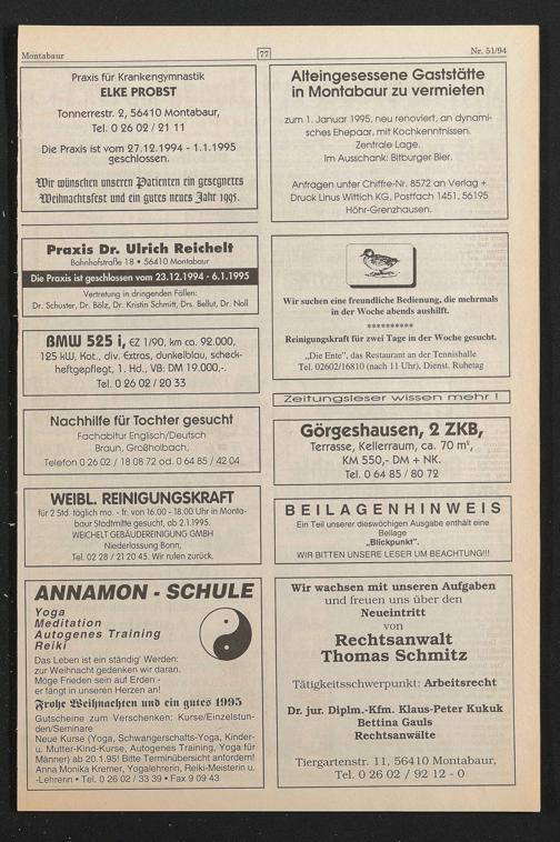 Die Praxis ist vom 27.12.1994 -1.1.1995 geschlossen.