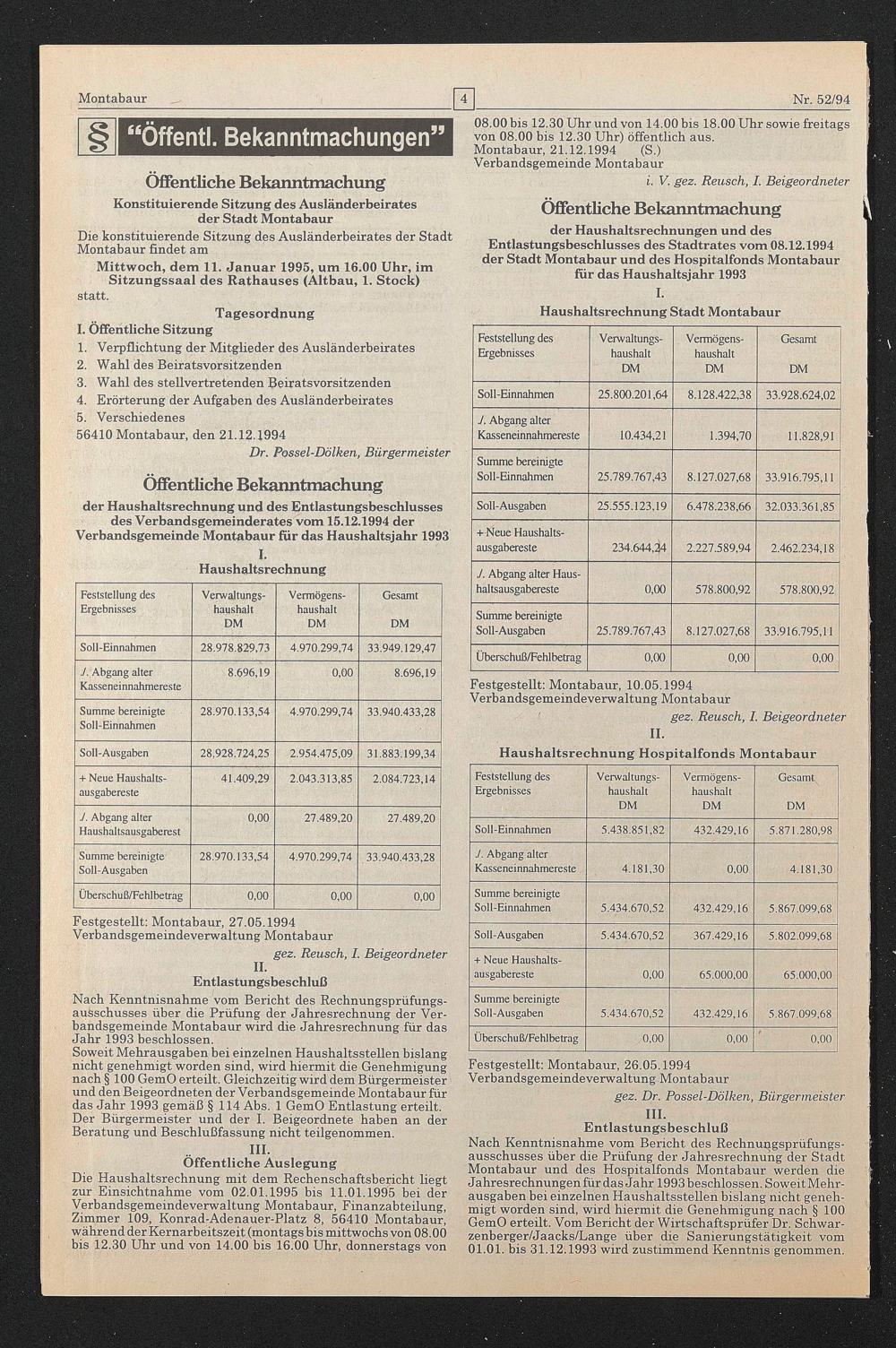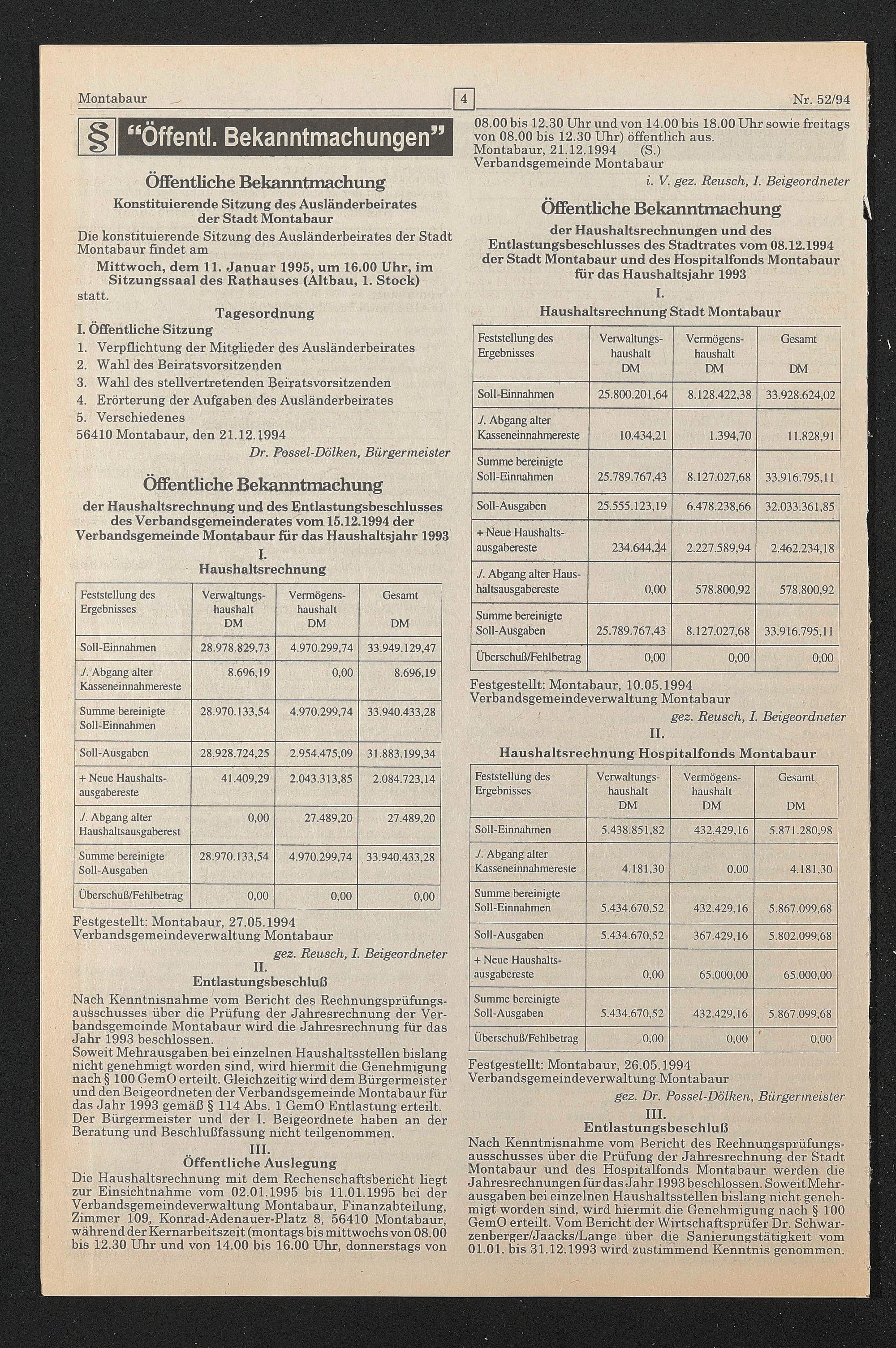 der Haushaltsrechnungen und des Entlastungsbeschlusses des Stadtrates vom 08.12.1994 der Stadt Montabaur und des Hospitalfonds Montabaur für das Haushaltsjahr 1993