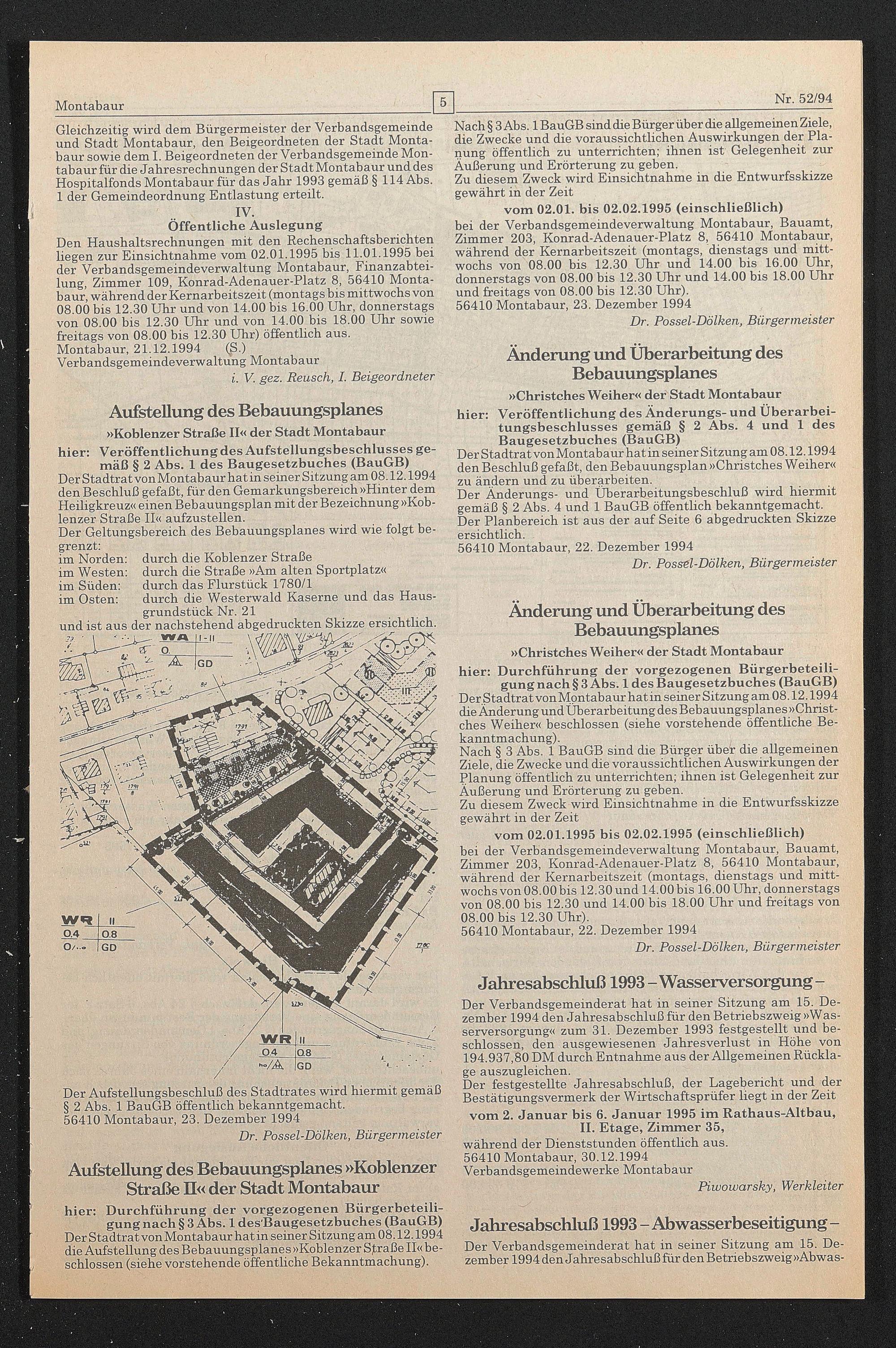 vom 02.01.1995 bis 02.02.1995 (einschließlich) bei der Verbandsgemeindeverwaltung Montabaur, Bauamt, Zimmer 203, Konrad-Adenauer-Platz 8, 56410 Montabaur, während der Kernarbeitszeit (montags, dienstags und mittwochs von 08.00 bis 12.30 und 14.00 bis 16.00 Uhr, donnerstags von 08.00 bis 12.30 und 14.00 bis 18.00 Uhr und freitags von 08.00 bis 12.30 Uhr).