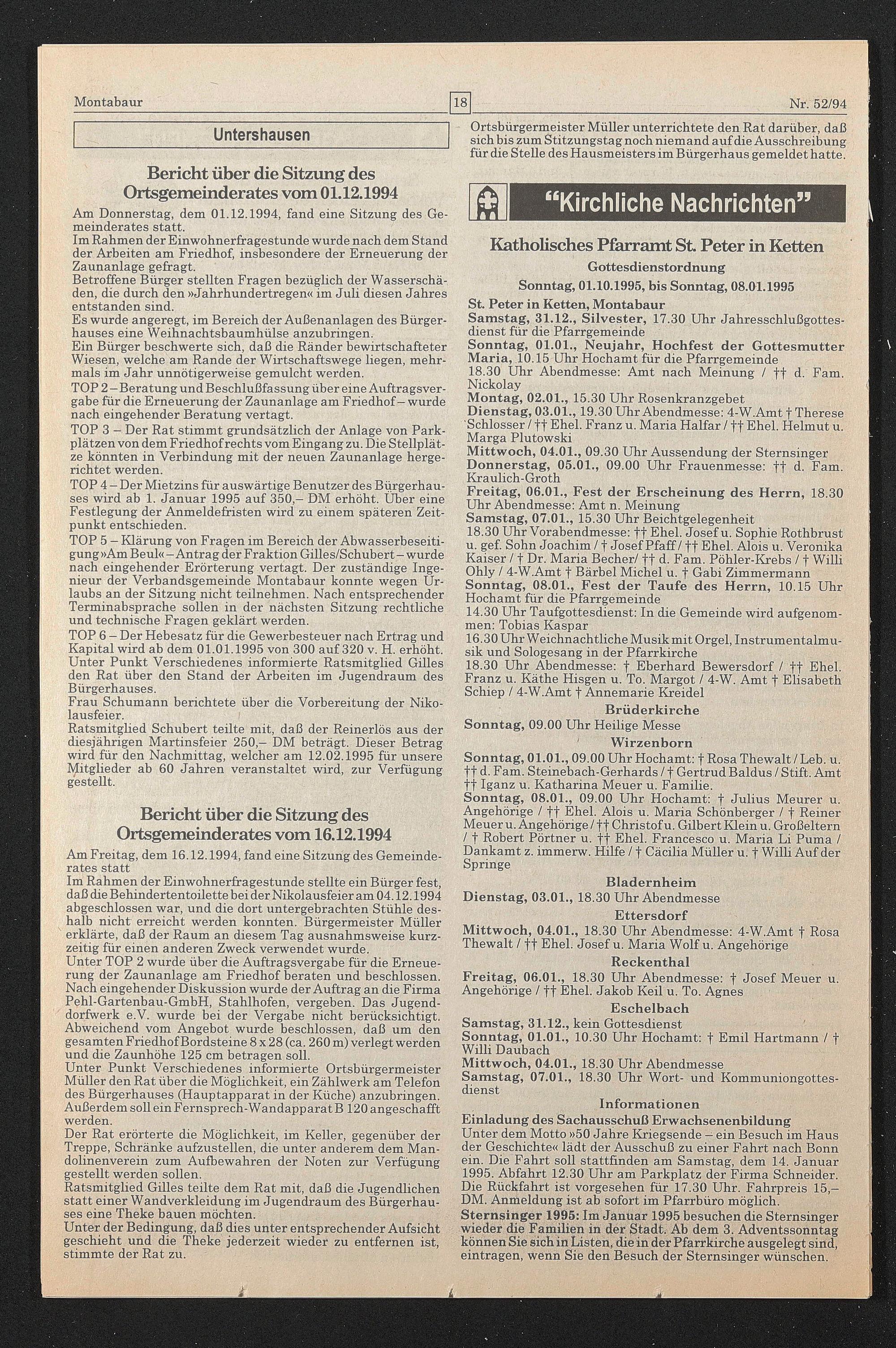 Bericht über die Sitzung des Ortsgemeinderates vom 16.12.1994