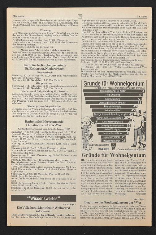 Diesen Immoblock erhalten Sie in allen Geschäftsstellen der Volksbank Montabaur-Wallmerod zum Preis von 10,— DM. Darüber hinaus bietet die Volksbank Montabaur-Wallmerod im Rahmen ihres Beratungs-Services einen kostenlosen Informationsabend für Bauherren an. Neben Unterlagen zu Finanzierungstechniken erhalten die Teilnehmer auch den oben erwähnten Immoblock — und zwar kostenlos.