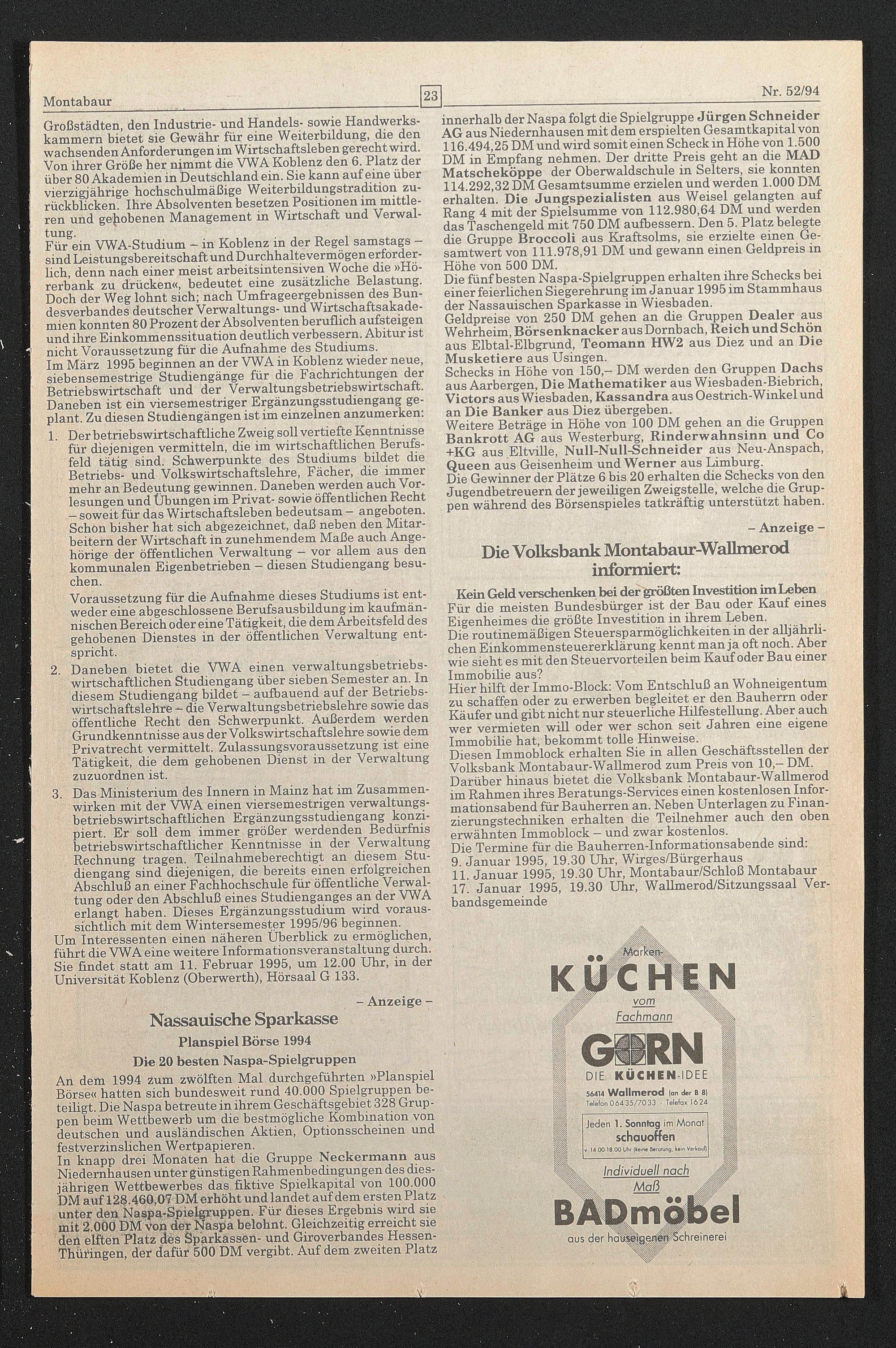 9. Januar 1995, 19.30 Uhr, Wirges/Bürgerhaus 11. Januar 1995, 19.30 Uhr, Montabaur/Schloß Montabaur 17. Januar 1995, 19.30 Uhr, Wallmerod/Sitzungssaal Verbandsgemeinde