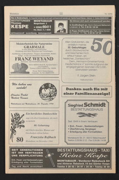 Neu in Niedererbach: Im Trauerfall können Sie sich auch vertrauensvoll wenden an: Familie Rudolf Becker, Hahnstr. 5, Telefon 06485/8284