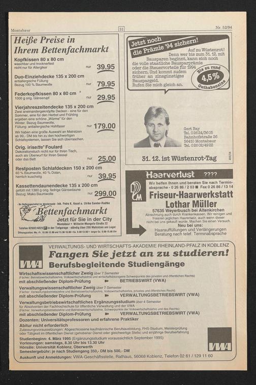 Auf zu Wüstenrot! Denn wer bis zum 31.12. mit Bausparen beginnt, kann sich noch die volle staatliche Bausparprämie oder die Steuervorteile für 1994. sichern. Und kommt zudem früher an zinsgünstiges Bauspargeld.