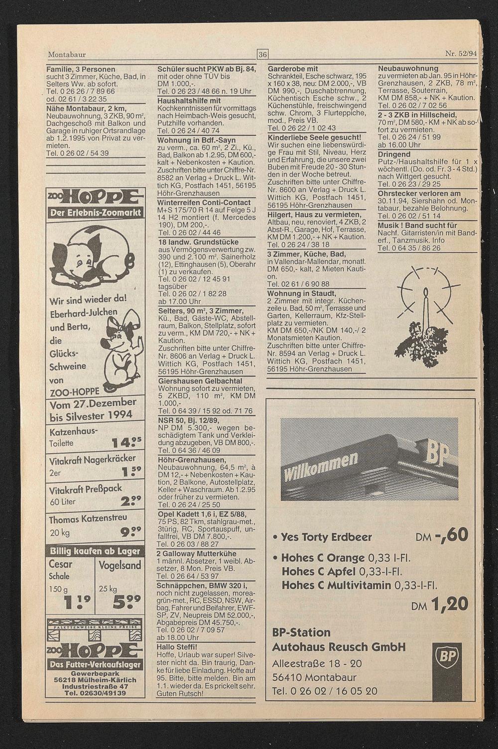 Wohnung in Bdf.-Sayn zu verm., ca. 60 m 2 , 2 Zi., Kü., Bad, Balkon ab 1.2.95, DM 600,- kalt + Nebenkosten + Kaution. Zuschriften bitte unterChiffre-Nr. 8582 an Verlag + Druck L. Wit- tich KG, Postfach 1451,56195 Höhr-Grenzhausen_