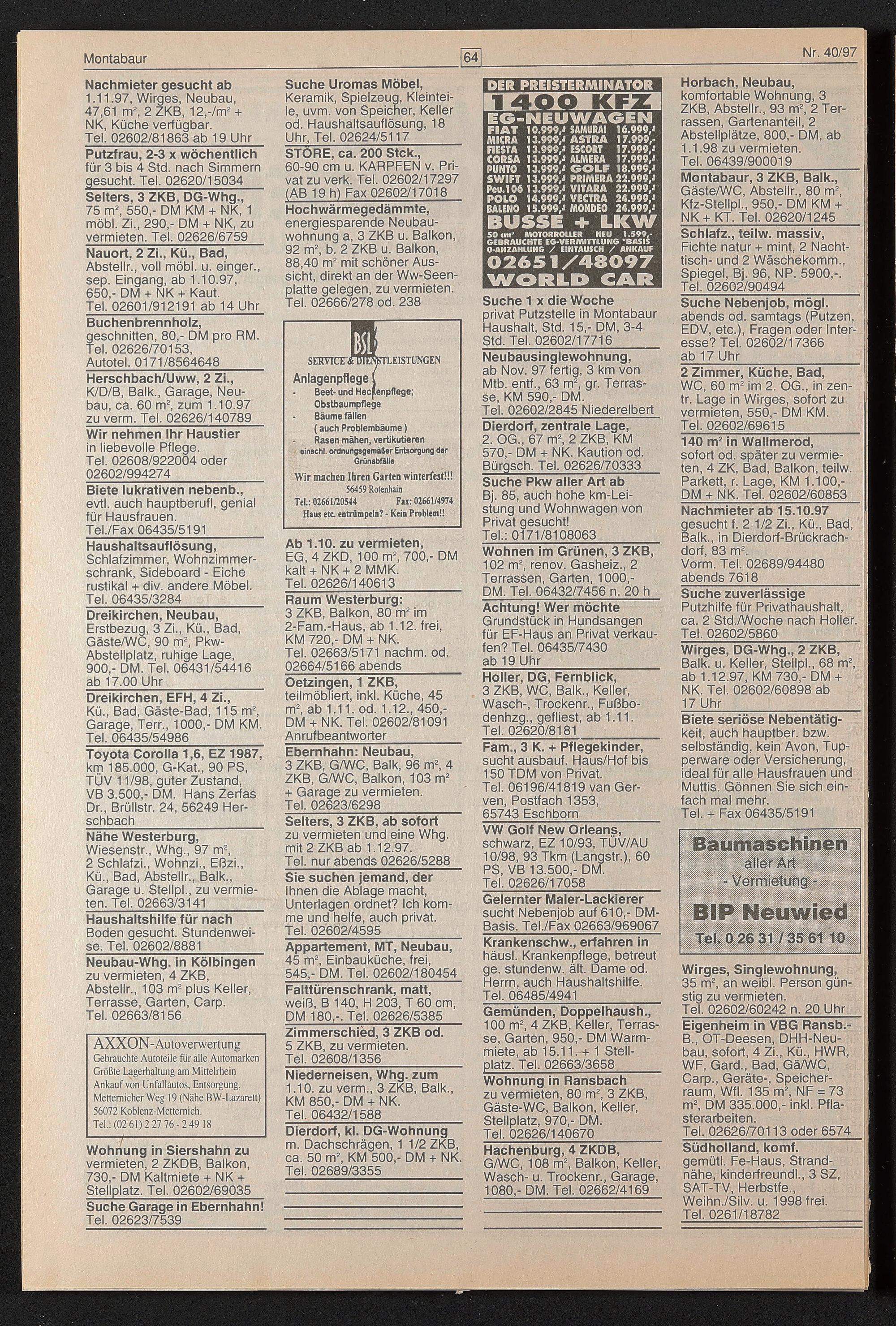 Wirges, DG-Whg., 2 ZKB, ;i Balk. u. Keller, Stellpl., 68 m 2 , :jj ab 1.12.97, KM 730,-DM +