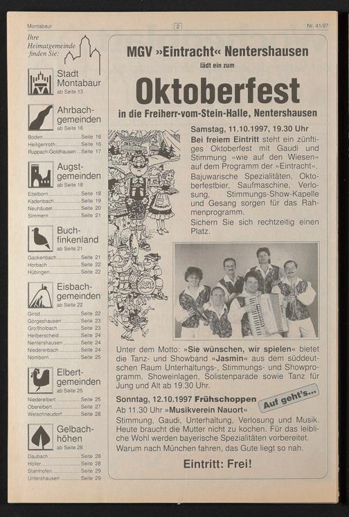 Samstag, 11.10.1997,19.30 Uhr Bei freiem Eintritt steht ein zünftiges Oktoberfest mit Gaudi und Stimmung »wie auf den Wiesen« auf dem Programm der »Eintracht«. Bajuwarische Spezialitäten, Oktoberfestbier, Saufmaschine, Verlosung, Stimmungs-Show-Kapelle und Gesang sorgen für das Rahmenprogramm.