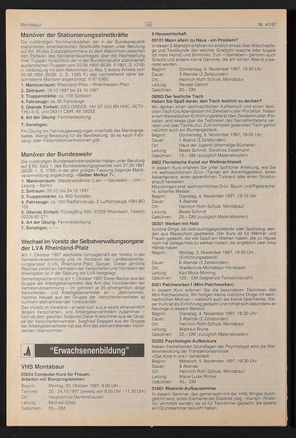 Die zuständigen Kommandostellen der in der Bundesrepublik stationierten amerikanischen Streitkräfte haben unter Berufung auf Art. 45 des Zusatzabkommens zu dem Abkommen zwischen den Parteien des Nordatlantikvertrages über die Rechtstellung ihrer Truppen hinsichtlich der in der Bundesrepublik stationierten ausländischen Truppen vom 03.08.1959 (BGBl. I11961, S. 1218) in Verbindung mit dem Abkommen zu Abs. 5 dieses Artikels vom 03.08.1959 (BGBl. II, S. 1355 ff.) das nachstehend näher beschriebene Manöver angekündigt: V 97-0360.