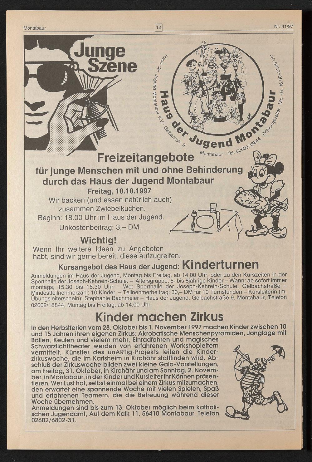 in den Herbstferien vom 28. Oktober bis 1. November 1997 machen Kinder zwischen 10 und 15 Jahren ihren eigenen Zirkus: Akrobatische Menschenpyramiden, Jonglage mit Bällen, Keulen und vielem mehr, Einradfahren und magisches Schwarzlichttheater werden von erfahrenen Workshopleitern vermittelt. Künstler des unARTig-Projekts leiten die Kinderzirkuswoche, die im Karlsheim in Kirchähr stattfinden wird. Abschluß der Zirkuswoche bilden zwei kleine Gala-Vorstellungen, am Freitag, 31. Oktober, in Kirchähr und am Sonntag, 2. November, in Montabaur, in der Kinder und Kursleiter ihr Können präsentieren. Wer Lust hat, selbst einmal bei einem Zirkus mitzumachen, den erwartet eine spannende Woche mit vielen Spielen, Spaß und erfahrenen Teamern, die die Betreuung während dieser Woche übernehmen.