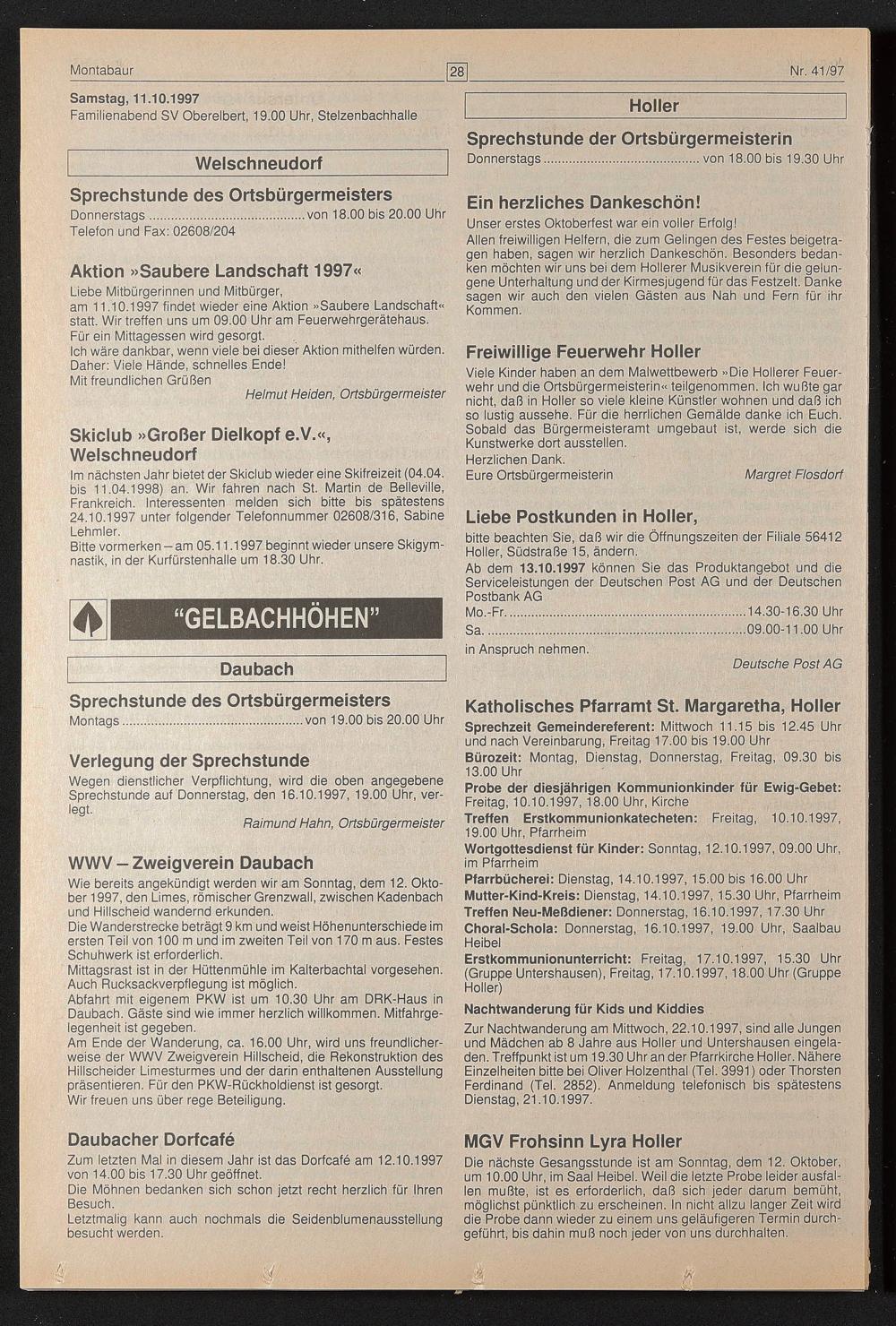 Pfarrbücherei: Dienstag, 14.10.1997,15.00 bis 16.00 Uhr Mutter-Kind-Kreis: Dienstag, 14.10.1997,15.30 Uhr, Pfarrheim Treffen Neu-Meßdiener: Donnerstag, 16.10.1997,17.30 Uhr Choral-Schola: Donnerstag, 16.10.1997, 19.00 Uhr, Saalbau Heibel