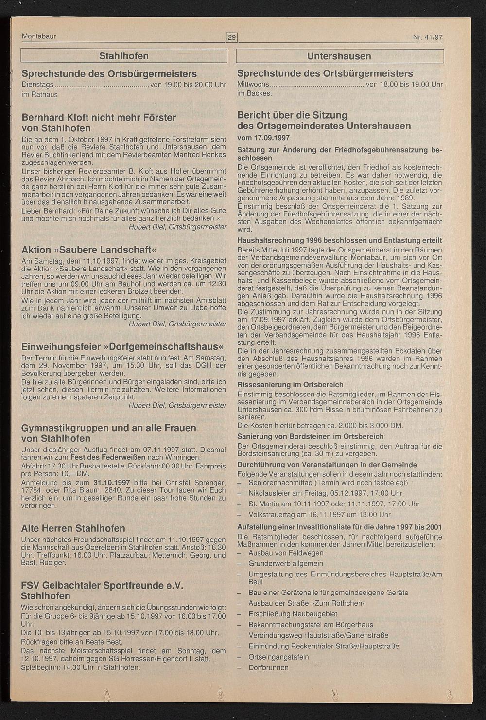 Bereits Mitte Juli 1997 tagte der Ortsgemeinderat in den Räumen der Verbandsgemeindeverwaltung Montabaur, um sich vor Ort von der ordnungsgemäßen Ausführung der Haushalts- und Kassengeschäfte zu überzeugen. Nach Einsichtnahme in die Haushalts- und Kassenbelege wurde abschließend vom Ortsgemeinderat festgestellt, daß die Überprüfung zu keinen Beanstandungen Anlaß gab. Daraufhin wurde die Haushaltsrechnung 1996 abgeschlossen und dem Rat zur Entscheidung vorgelegt.
