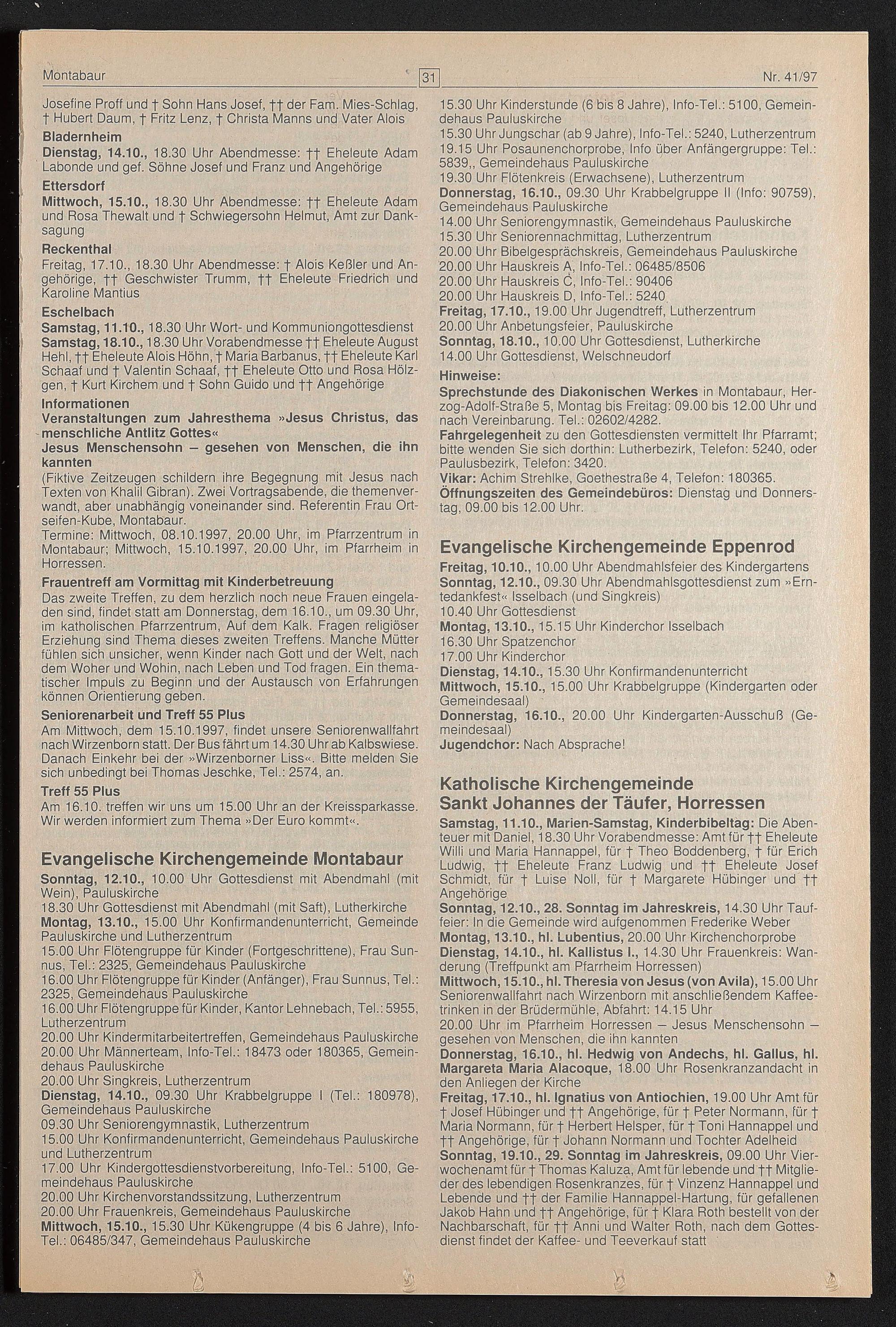 Termine: Mittwoch, 08.10.1997, 20.00 Uhr, im Pfarrzentrum in Montabaur; Mittwoch, 15.10.1997, 20.00 Uhr, im Pfarrheim in Horressen.