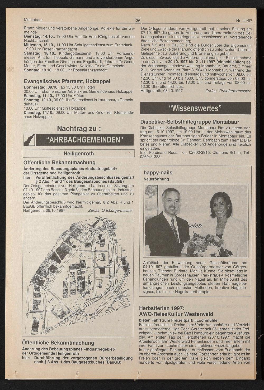 Der Ortsgemeinderat von Heiligenroth hat in seiner Sitzung am 07.10.1997 die generelle Änderung und Überarbeitung des Bebauungsplanes »Industriegebiet« beschlossen (s. vorstehende öffentliche Bekanntmachung).