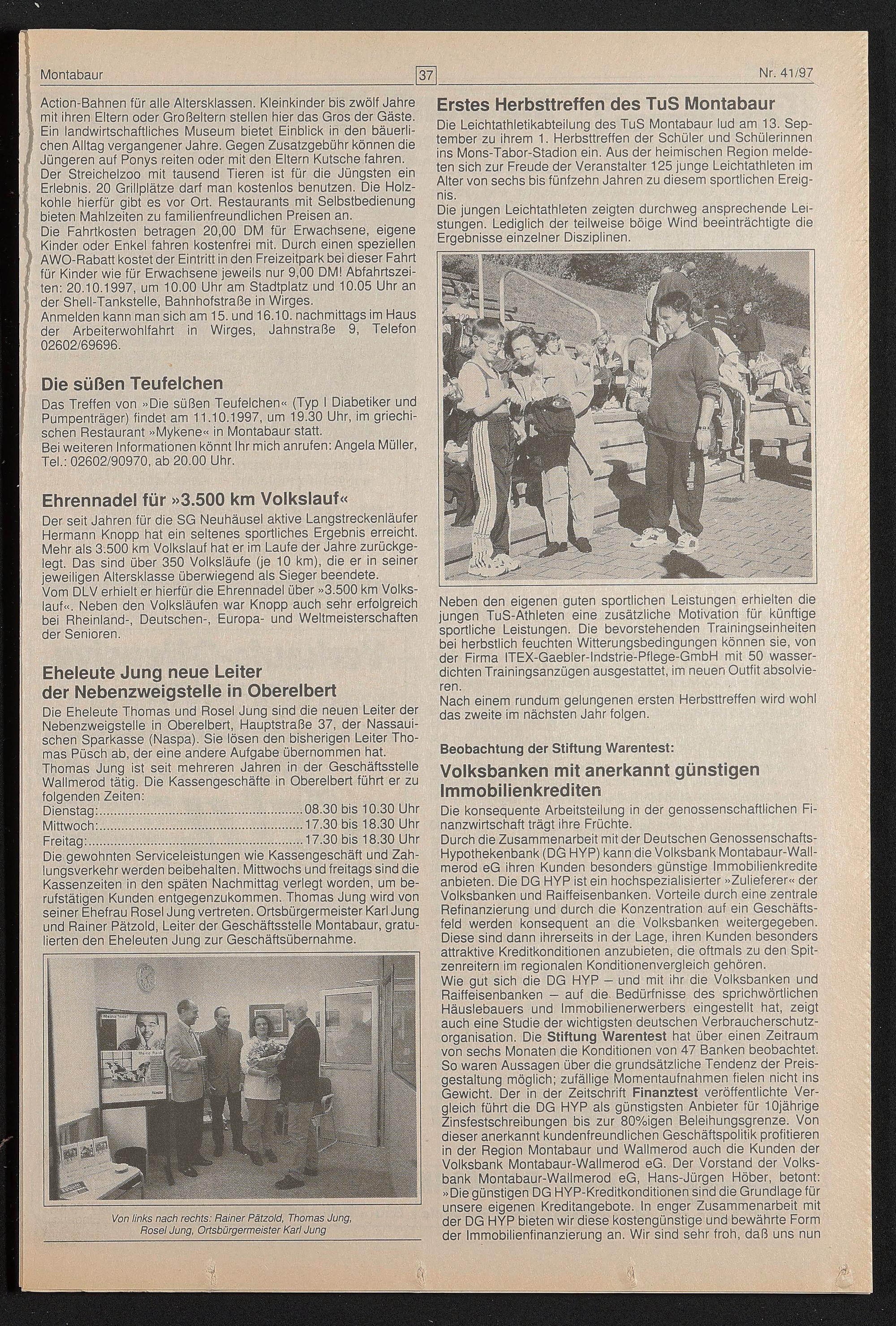 Die Eheleute Thomas und Rosel Jung sind die neuen Leiter der Nebenzweigstelle in Oberelbert, Hauptstraße 37, der Nassaui- schen Sparkasse (Naspa). Sie lösen den bisherigen Leiter Thomas Püsch ab, der eine andere Aufgabe übernommen hat. Thomas Jung ist seit mehreren Jahren in der Geschäftsstelle Wallmerod tätig. Die Kassengeschäfte in Oberelbert führt er zu folgenden Zeiten: