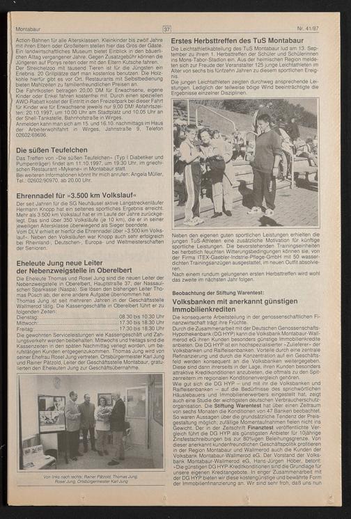 Die gewohnten Serviceleistungen wie Kassengeschäft und Zahlungsverkehr werden beibehalten. Mittwochs und freitags sind die Kassenzeiten in den späten Nachmittag verlegt worden, um berufstätigen Kunden entgegenzukommen. Thomas Jung wird von seiner Ehefrau Rosel Jung vertreten. Ortsbürgermeister Karl Jung und Rainer Pätzold, Leiter der Geschäftsstelle Montabaur, gratulierten den Eheleuten Jung zur Geschäftsübernahme.
